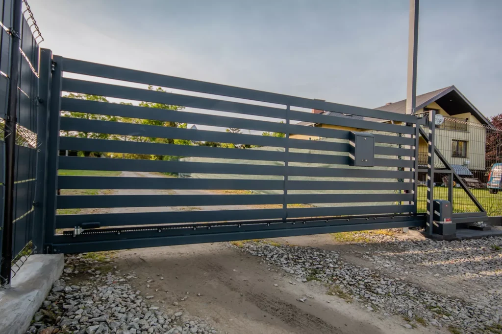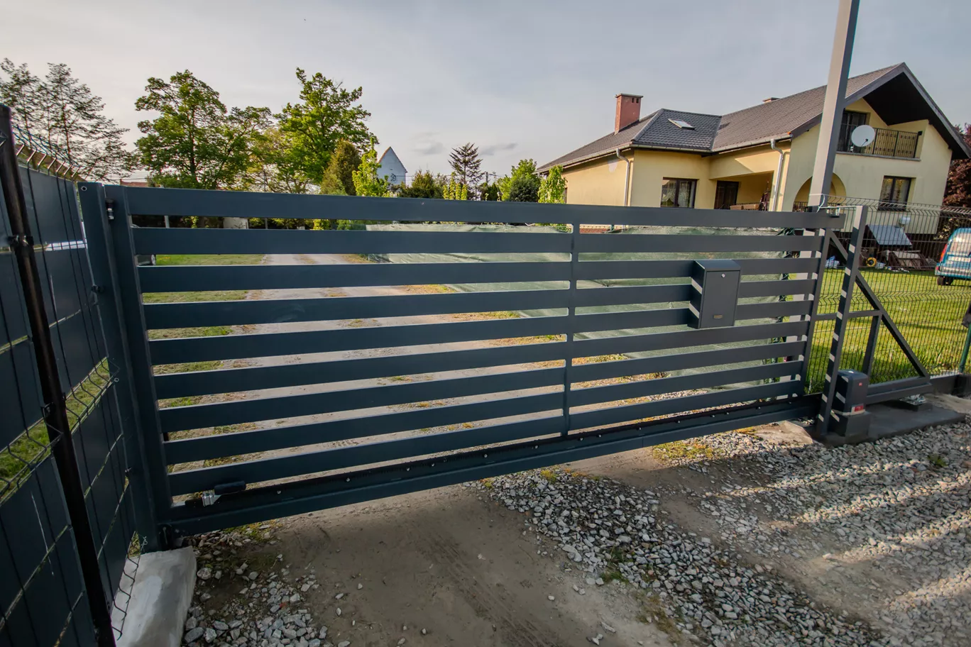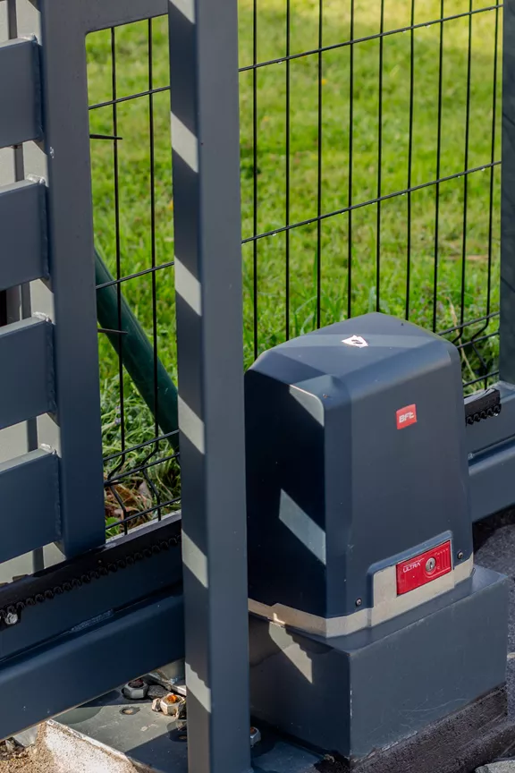Brama przesuwna, ze stali ocynkowanej, malowana proszkowo. Wypełnienie stworzyliśmy z poziomych profili zamkniętych. Zrealizowaliśmy usługę kompleksowo: projekt, produkcja, montaż bramy i instalacja napędu automatycznego BFT.