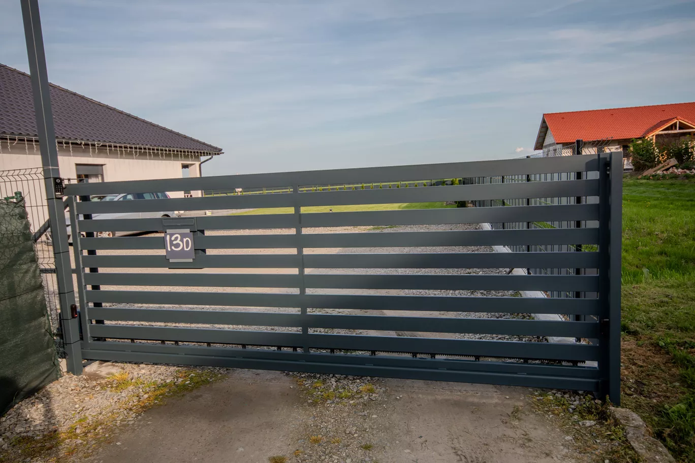 Uzyskaliśmy minimalistyczną formę, z poziomymi lamelami w kolorze antracytowym, tworząc prostą linię – zgodną z życzeniem klienta. Brama nie dominuje nad bryłą domu, a elegancko ją dopełnia i podkreśla nowoczesny styl.