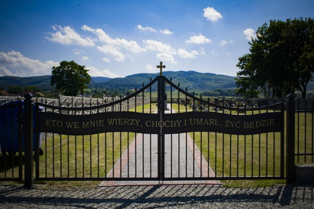 Zwieńczeniem realizacji jest efektowny, pozłocony krzyż oraz pozłocony cytat z Biblii, który wyraźnie wyróżnia się na tle bramy. Wybrany fragment niesie przesłanie nadziei — przypomina, że dla wierzących życie nie kończy się na ziemi.